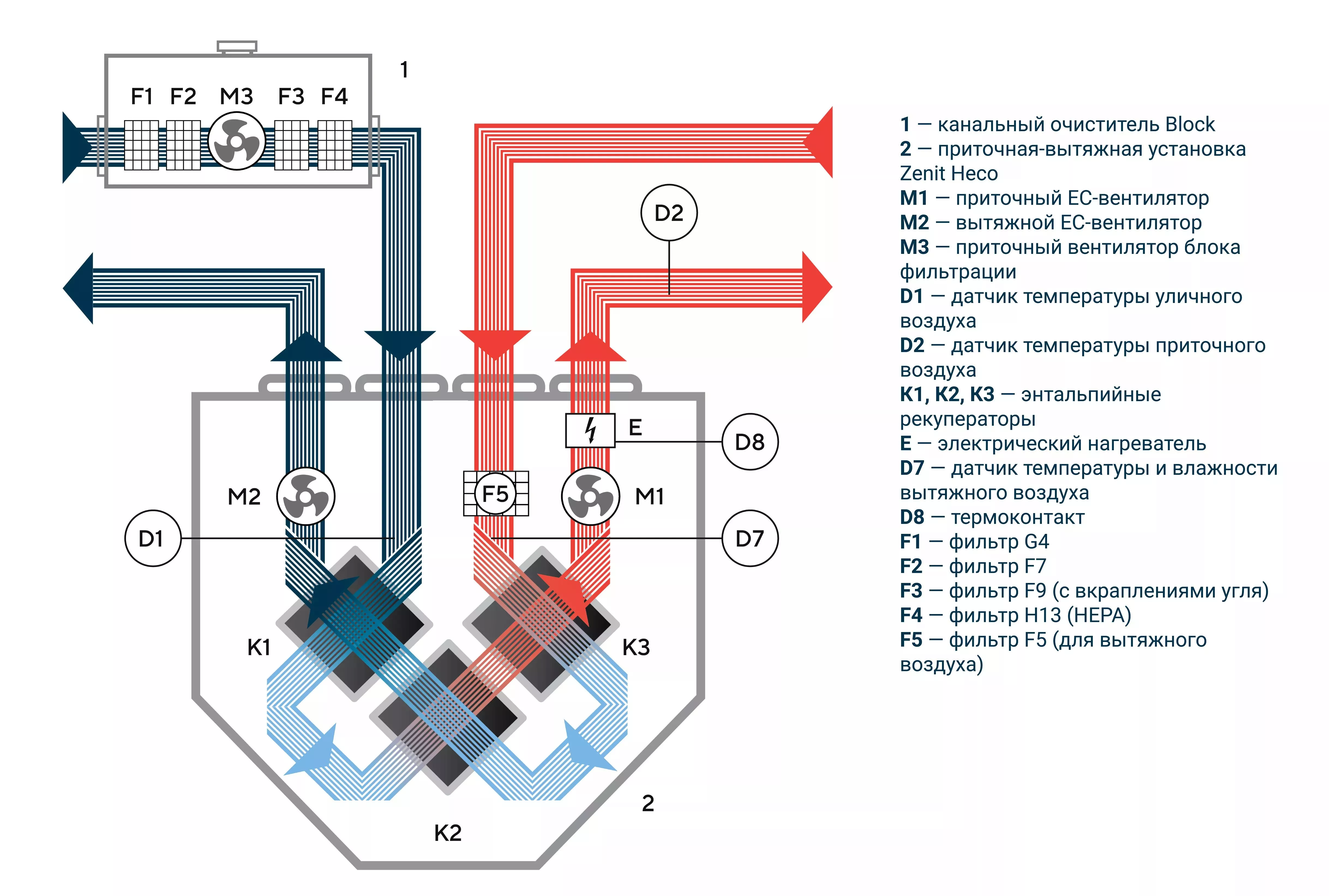Функциональная схема приточной вентиляции с высокой степенью фильтрации следующая: